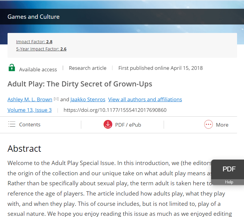 Brown, A. and Stenros, J. 2018. “Adult Play: The Dirty Secret of Grown Ups”. Games and Culture. 13(3), pp 215-219. https://journals.sagepub.com/doi/full/10.1177/1555412017690860
