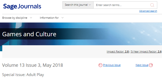 Brown, A. and Stenros, J. (eds.) 2018. Adult Play Special Issue. Games and Culture. 13 (3). Pp. 215-321. https://journals.sagepub.com/toc/gaca/13/3