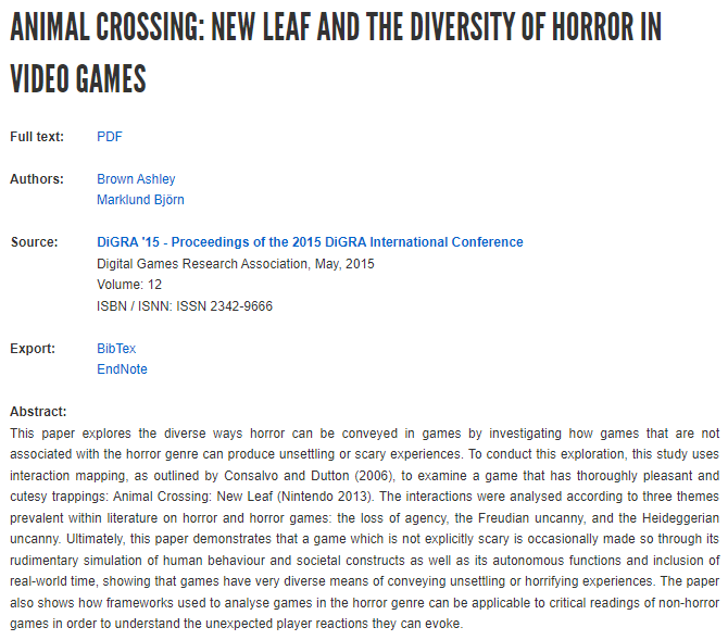 Brown, A. and Berg Marklund, B. (2015). ‘Animal Crossing: New Leaf and the Diversity of Horror in Video Games’, proceedings of the 8th Digital Games Research Association conference. 14 May 2015. http://www.digra.org/digital-library/publications/animal-crossing-new-leaf-and-the-diversity-of-horror-in-video-games/