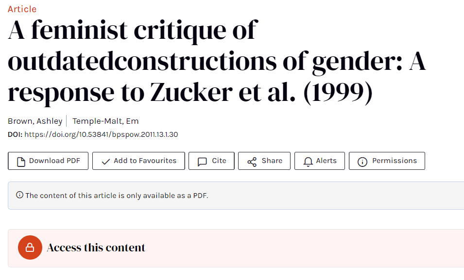 Brown, A. and Temple, E. M. (2011). ‘A Feminist Critique of Outdated Constructions of Gender: A response to Zucker et al. (1999)’. Psychology of Women Section Review. 13 (1). https://explore.bps.org.uk/content/bpspow/13/1/30