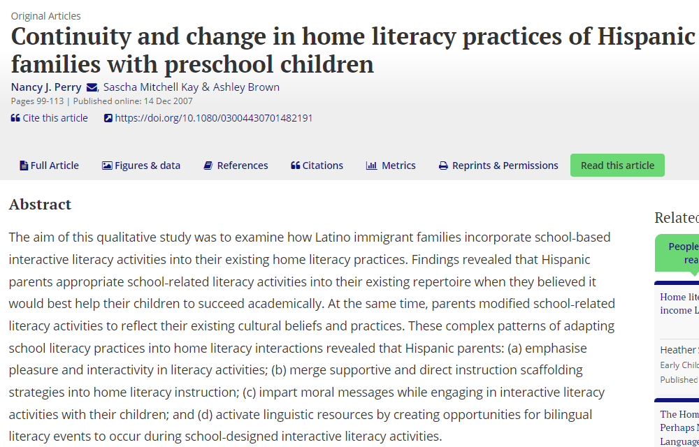 Perry, N., Mitchell Kay, S., Brown, A. (2007) “Continuity and Change in Home Literacy Practices of Hispanic Families with Preschool Children” in Early Childhood Development and Care. Volume 178, issue 1. https://www.tandfonline.com/doi/abs/10.1080/03004430701482191