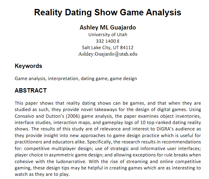 Guajardo, A. 2024. “Reality Dating Show Game Analysis.” Proceedings of the Digital Games Research Association Conference 2024. Guadalajara, MX.
